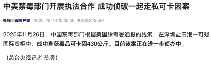 据央视新闻音讯,2025年11月26日,中国禁毒部门说明好意思国缉毒署通报的陈迹,在深圳盐田港一可疑外舶来品柜中,得手查获毒品可卡因430公斤。当今该案正在进一步侦办中。