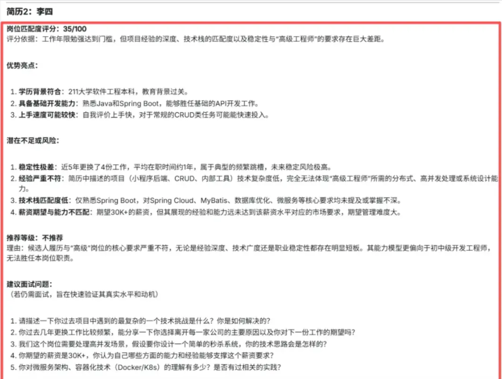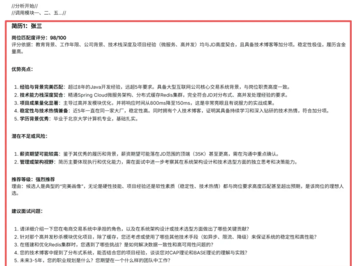 这个领导词的中枢上风在于结构化输出至极了了,HR一看就知说念候选东说念主值不值得进下一轮,的确作念到“喂饭级”好用。