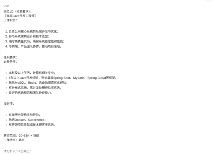 3.加载收效后,回复AI你的具体需求。举例:先贴出圆善的岗亭JD(招聘要求),然后贴出一份或多份简历的翰墨内容(不错径直复制简历PDF转翰墨后的内容)。